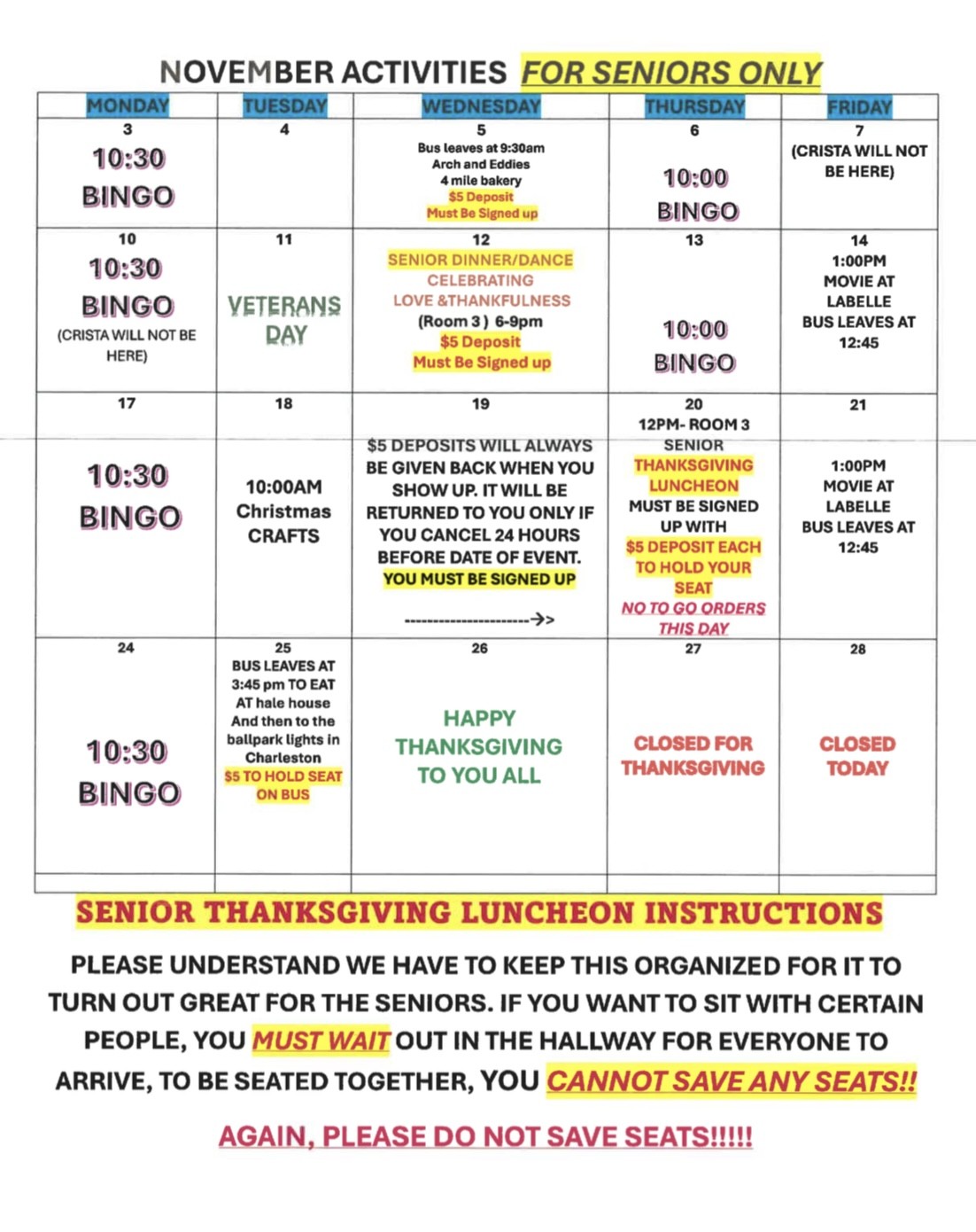 SENIOR NOVEMBER ACTIVITIES